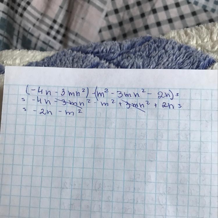 ( - 4n - 3mn^2 ) - ( m^2 - 3mn^2 - 2n ) = - 4n - 3mn^2 - m^2 + 3mn^2 + 2n = - 2n - m^2
