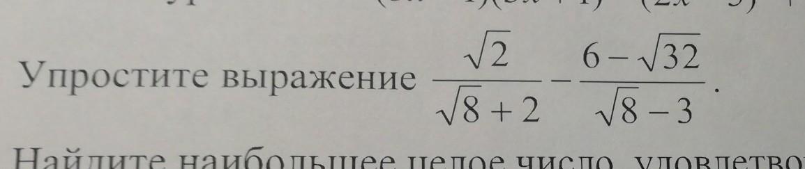 dfrac{sqrt{2}}{sqrt{8}+2}-dfrac{6-sqrt{32}}{sqrt{8}-3}=dfrac{sqrt{2}}{2sqrt{2}+2}-dfrac{6-4sqrt{2}}{2sqrt{2}-3}=dfrac{1}{2+sqrt{2}}+dfrac{2(3-2sqrt{2})}{3-2sqrt{2}}= \ =dfrac{1}{2+sqrt{2}}+2=dfrac{5+2sqrt{2}}{2+sqrt{2}}=dfrac{(5+2sqrt{2})(2-sqrt{2})}{4-2}=dfrac{10+4sqrt{2}-5sqrt{2}-4}{2}= \ =dfrac{6-sqrt{2}}{2}