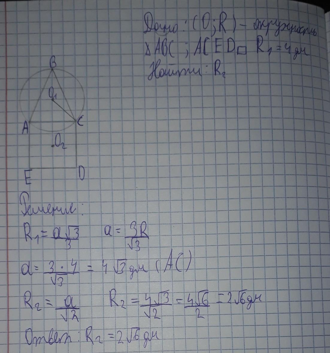 В окружность, радиус которой 4 дм, вписан правильный треугольник, на стороне которого построен квадрат. Найдите радиус окружности описанной около квадрата.