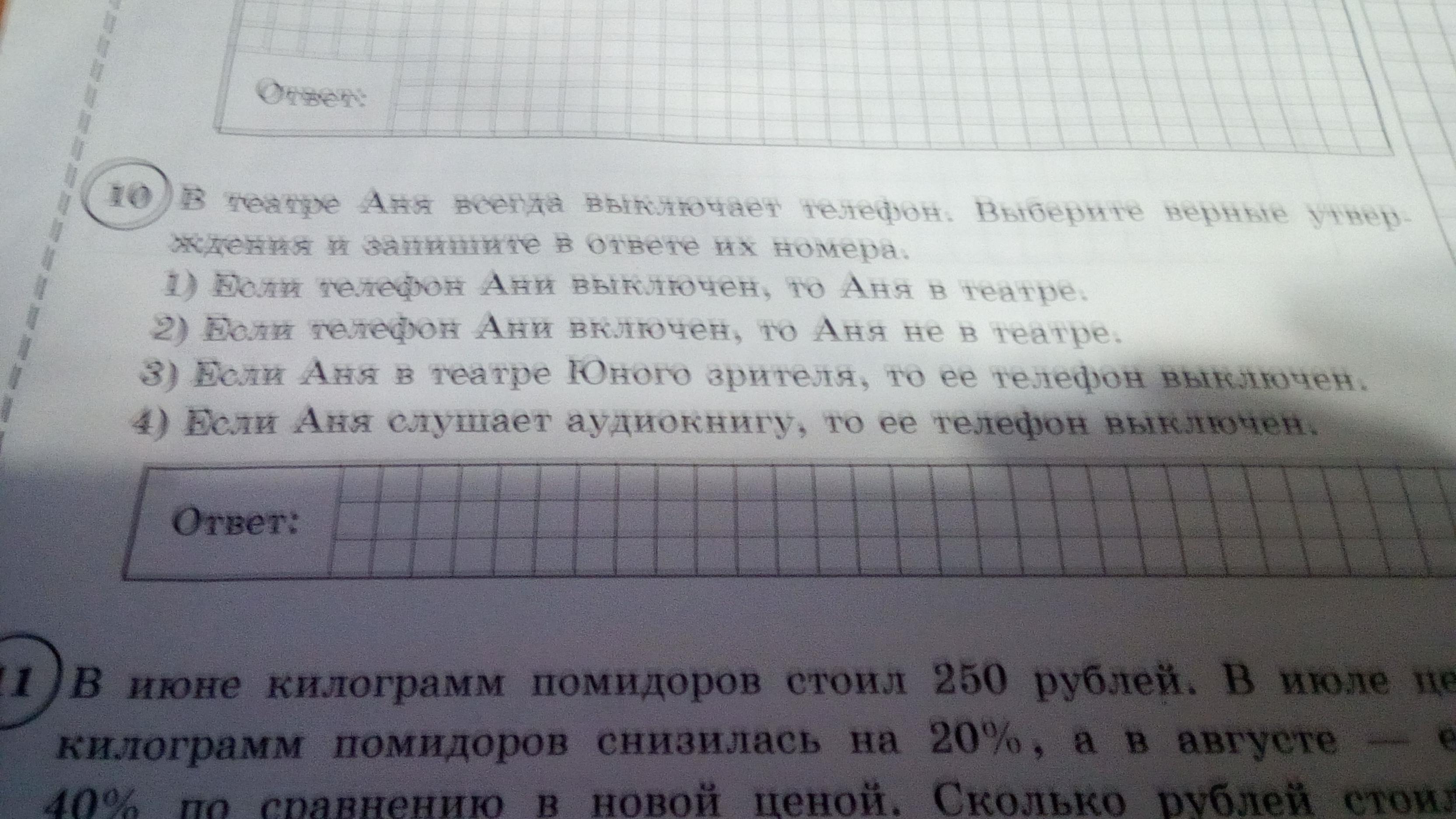 Верны утверждения 2,3. 1 не верно потому, что у Ани телефон может быть выключен не только в театре. 4 не верно потому, что в условии говорится только о том, что Аня всегда выключает телефон, когда находится в театре.