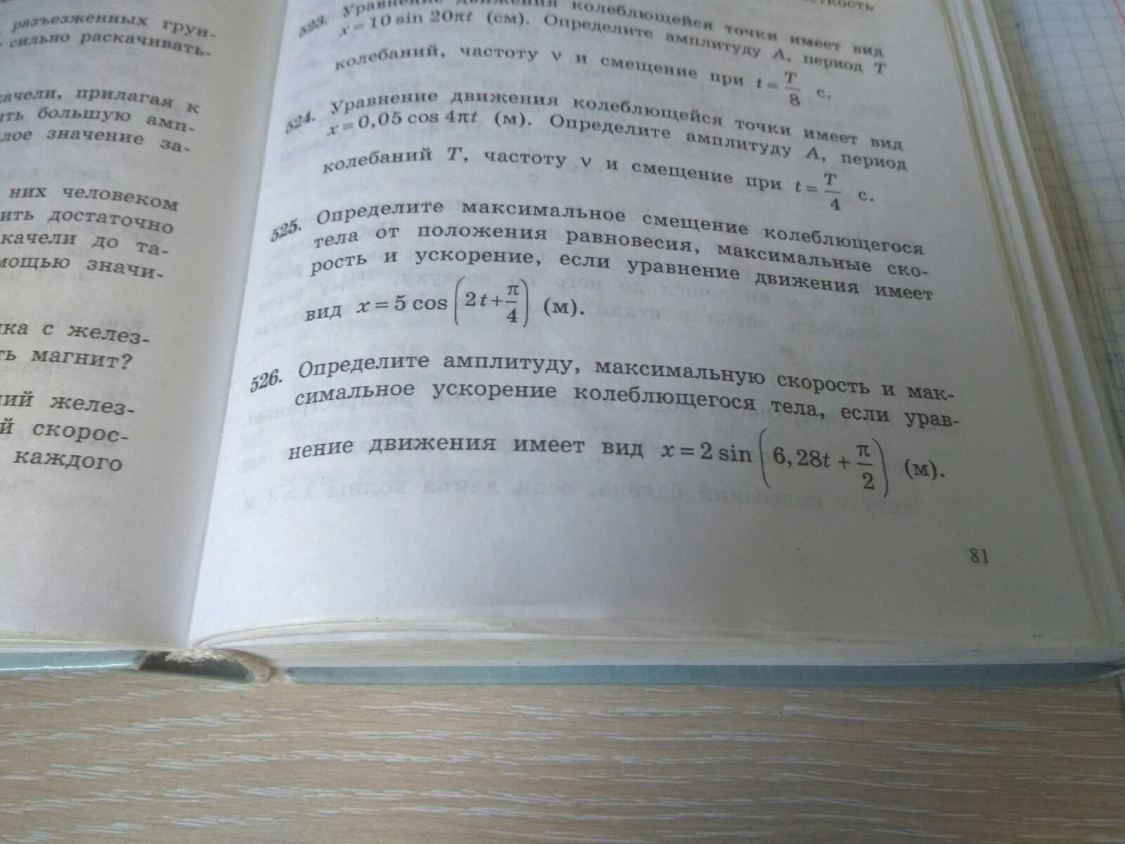 у нас уравнение колебаний имеет стандартный вид x=Acos(wt+ф0), в данном случае у нас здесь перед косинусом стоит коэффициент А - это и естб максимальное смещение. далее, чтоб найти скорость нужно найти производную, а потом, чтоб найти ускорение, надо найти производную от скорости