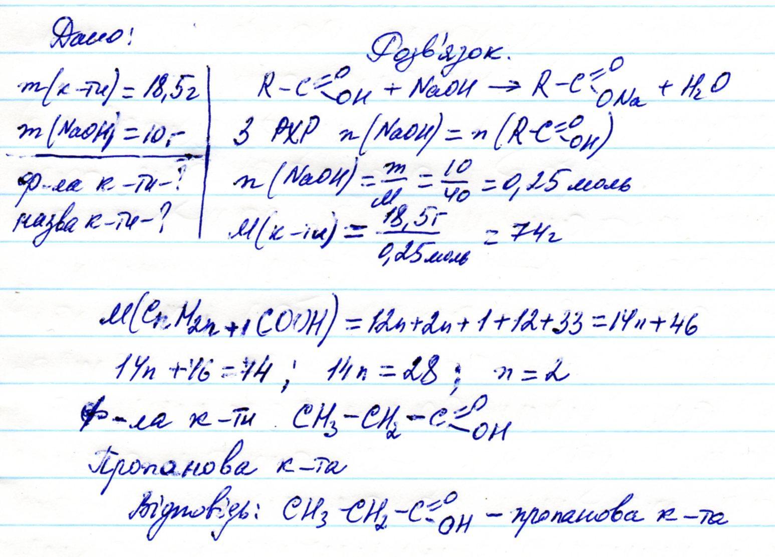 На нейтралізацію 18,5г насиченої одноосновної кислоти потрібний розчин, що містить 10г натрій гідроксиду. Визначте молекулярну формулу кислоти. Назвіть її.