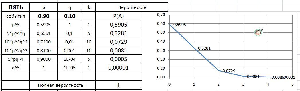 Р(А)⁵ = (p+q)⁵ = p⁵+5*p⁴*q + 10*p³*q² + 10*p²*q³ + 5*p*q⁴ + q⁵ = 1.
