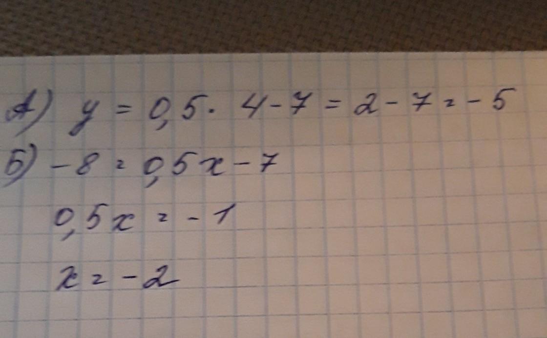 помогите пожалуйста! Функция задана формулой у=1/2x-7Найдите: а) значение функции,соответствующее значению аргумента, равному 4;б) значение аргумента, при котором значение функции равно -8.