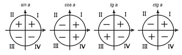 Знак определяется по косинусу и тангенсу(котангенсу) этих углов.