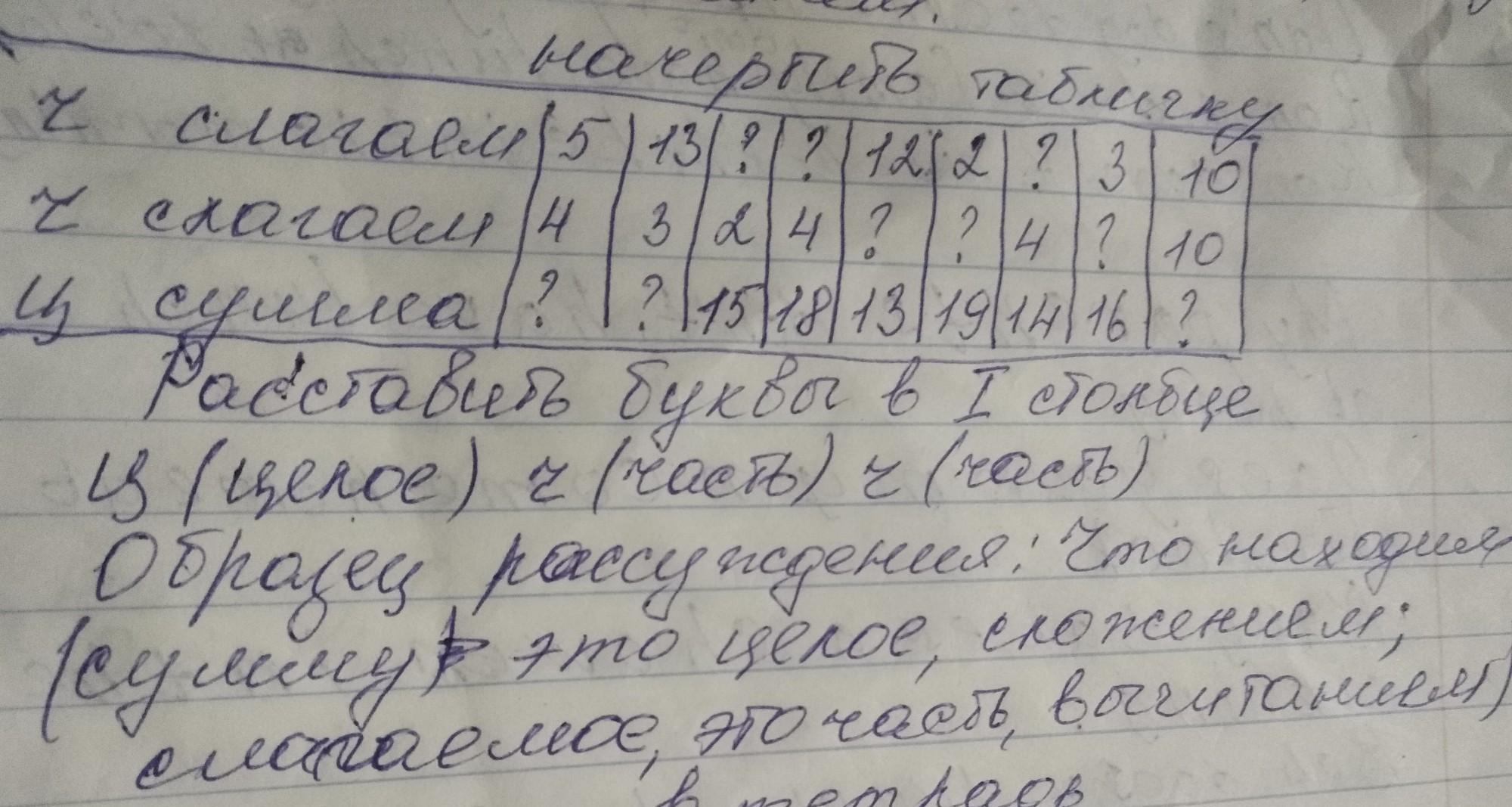 где есть два слагаемых, просто высчитываешь сумму. Где одно слагаемое и сумма - из суммы вычитаешь известное слагаемое