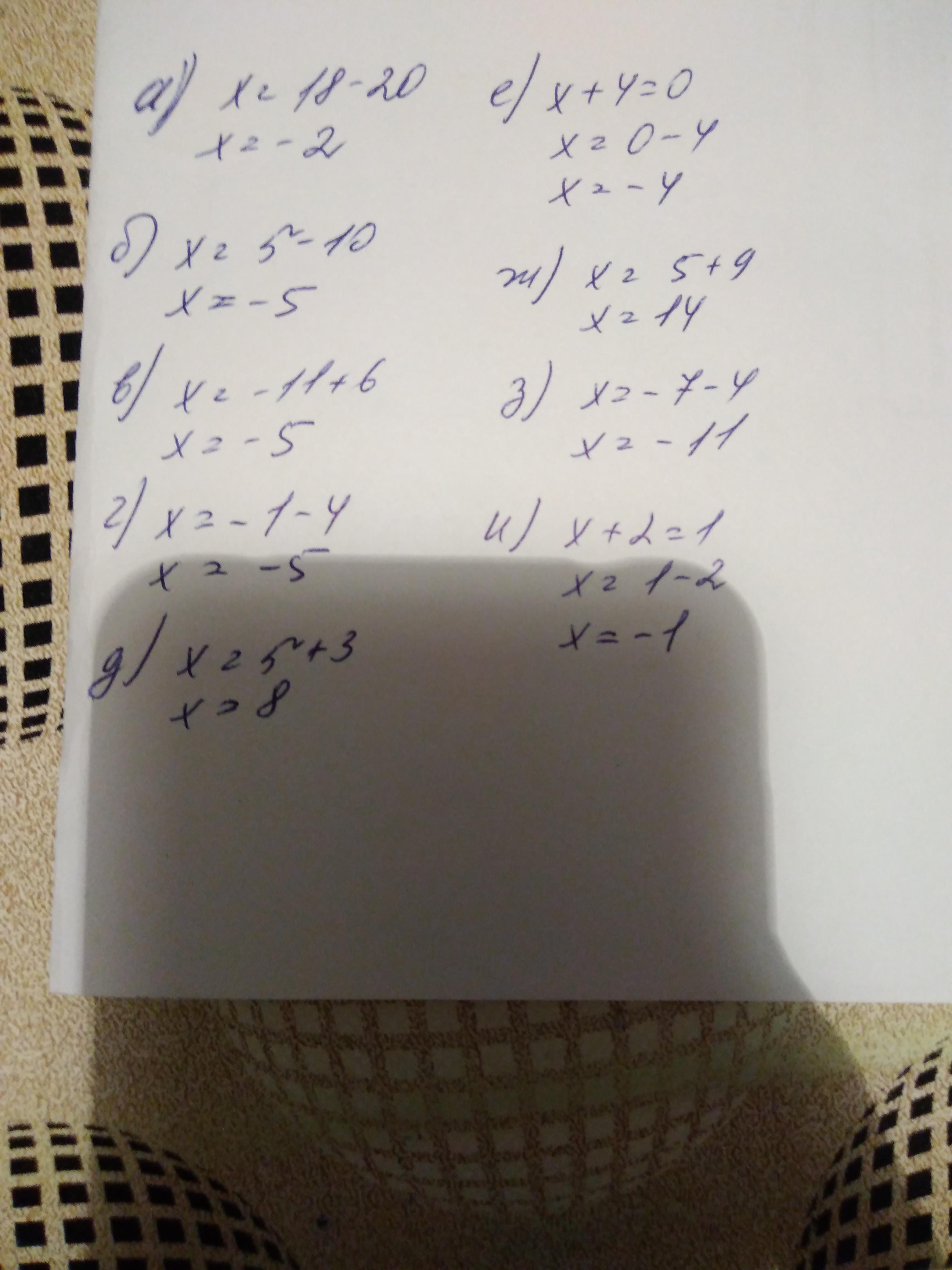а)х=18-20 б)х=5-10 в)х=-11+6 г)х=-1-4 д)х=5+3 е)х+4=0 х=-4 ж)х=5+9 з)х=-7-4 и)х+2=1 х=1-2