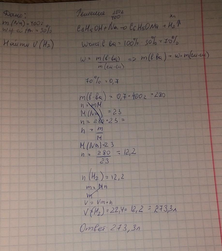 2) Рассчитайте объем газа, выделившегося при взаимодействии фенола с Na массой 400 г, содержащее 30% примесей.