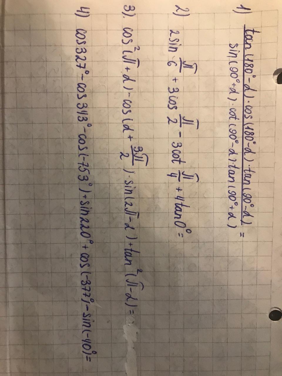 2) sinπ/6 + 3cosπ/2 - 3ctgπ/4 + 4tg0° = 1/2 + 3 · 0 - 3 · 1 + 4 · 0 =
