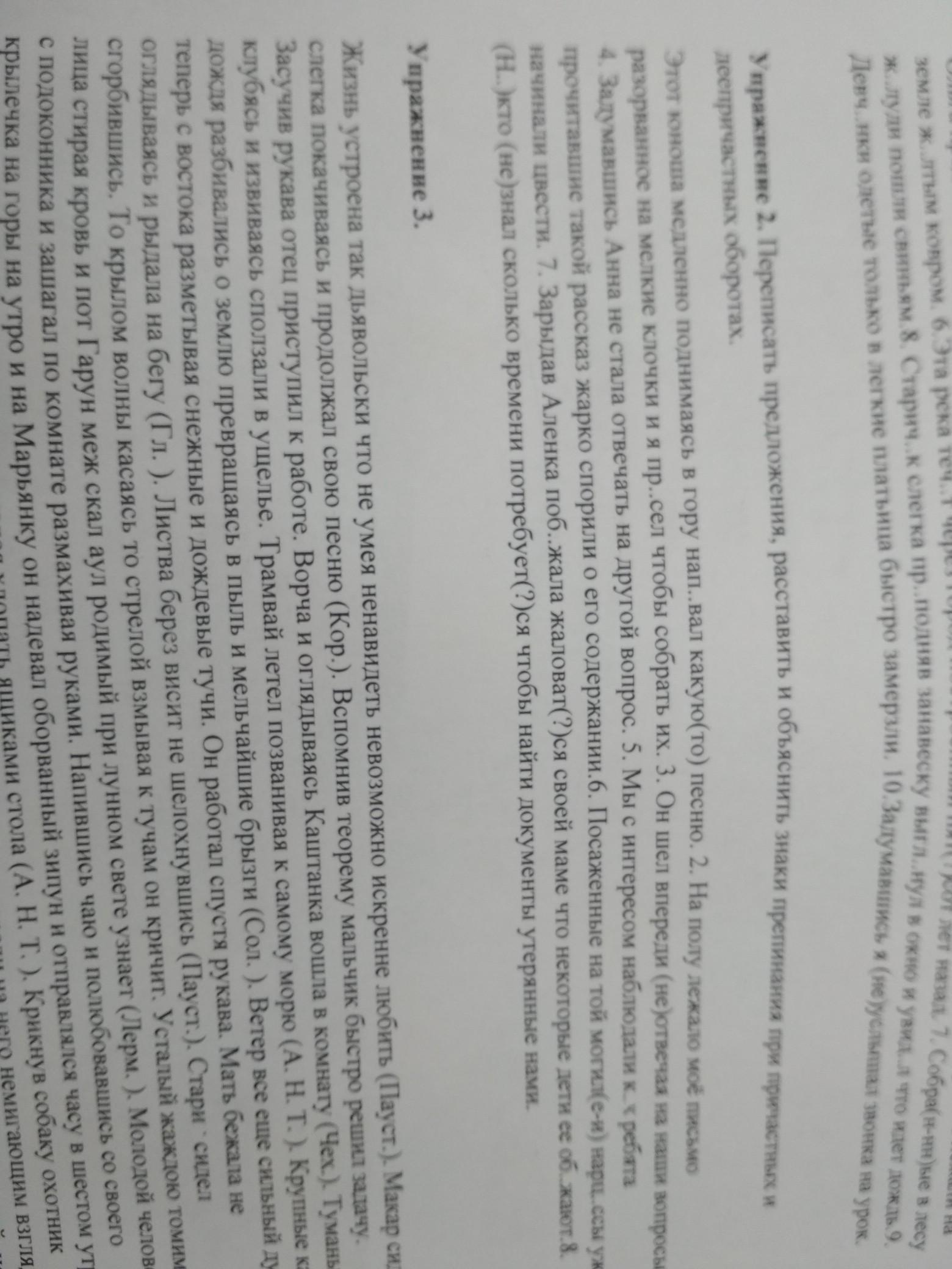 1. Этот юноша медленно поднимаясь в гору, напевал какую-то песню. ("этот юноша медленно поднимаясь в гору" - деепричастный оборот, "поднимаясь" - само деепричастие) 2. На полу лежало мое письмо, разорванное на мелкие клочки, и я присел, чтобы собрать их. ("разорванное на мелкие клочки" - причастный оборот, "разорванное" - само причастие) 3.Он шёл впереди, не отвечая на наши вопросы. ("не отвечая на наши вопросы" - деепричастный оборот, "не отвечая" - само деепричастие) 4.Задумавшись, Анна не стала отвечать на другой вопрос. ("задумавшись" - деепричастный оборот, состоящий только из одного деепричастия) 5. Мы с интересом наблюдали как ребята, прочитавшие такой рассказ, жарко спорили о его содержании. ("прочитавшие такой рассказ" - причастный оборот, "прочитавшие" - само причастие) 6.Посаженные на той могиле нарциссы, уже начинали цвести. ("посаженные на той могиле нарцисы" - причастный оборот, "посаженные" - само причастие) 7. Зарыдав, Алёнка побежала жаловаться своей маме, что некоторые дети её обижают. ("зарыдав" - деепричастный оборот, состоящий из одного деепричастия) 8. Никто не знал, сколько времени потребуется, чтобы найти документы, потерянные нами. ("потерянные нами" - причастный оборот, "потерянные" - само причастие)