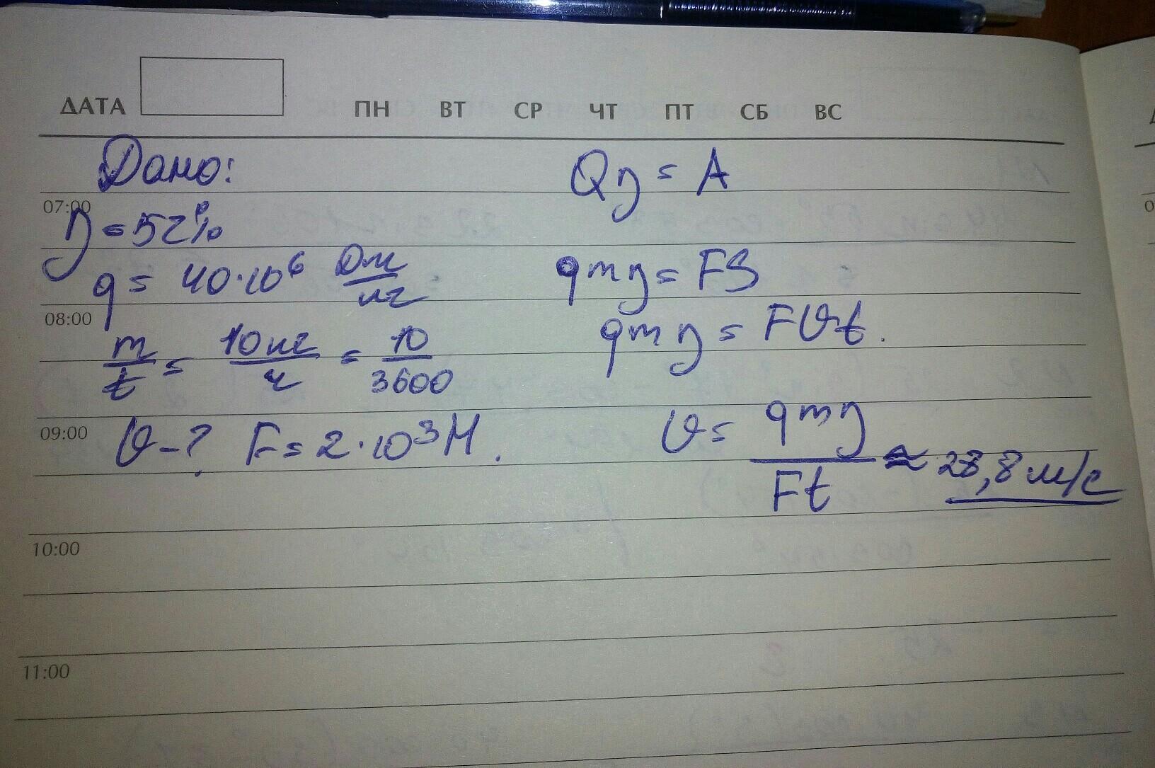 Кпд двигателя мотоцикла равен 52%. в качестве топлива в двигателе используется бензин с удельной теплотой сгорания 40мдж/кг. расход бензина 10кг/ч. определи скорость движения мотоцикла, если сила тяги двигателя равна 2кн.