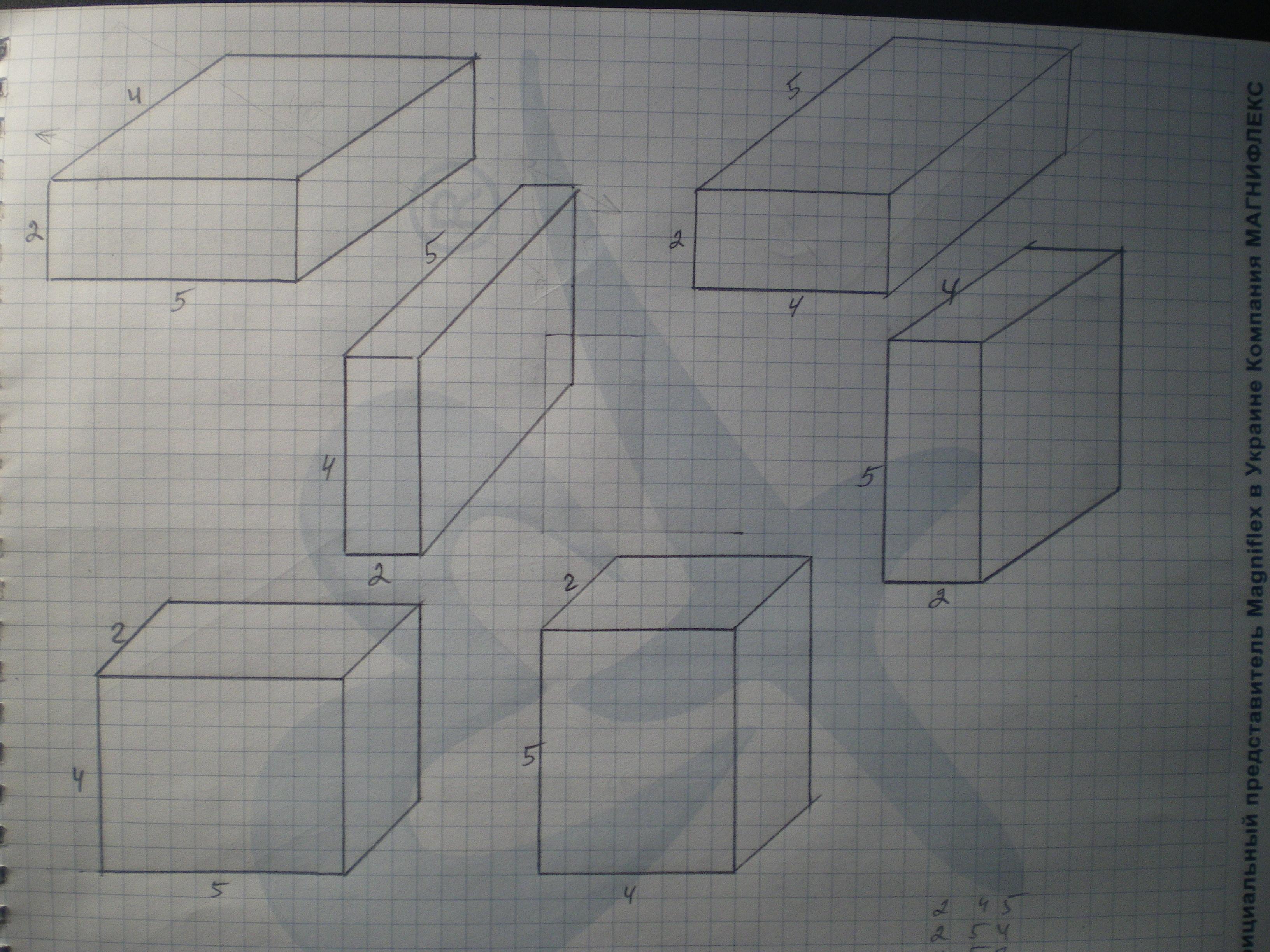 используя клетки тетради изобразите прямоугольный параллелепипед измерения которого равны 2см,4см и 5 см .Сколько прямоугольных параллелепипедов можно построить?