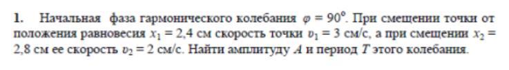 Начальная фаза гармонических колебаний φ = 90градусов. При смещении точки от положения равновесия x1=2,4см, скорость точки V1=3см/с, а при смещении x2=2,8см ее скорость V2=2см/c. Найти амплитуду A и период Т этого колебания.