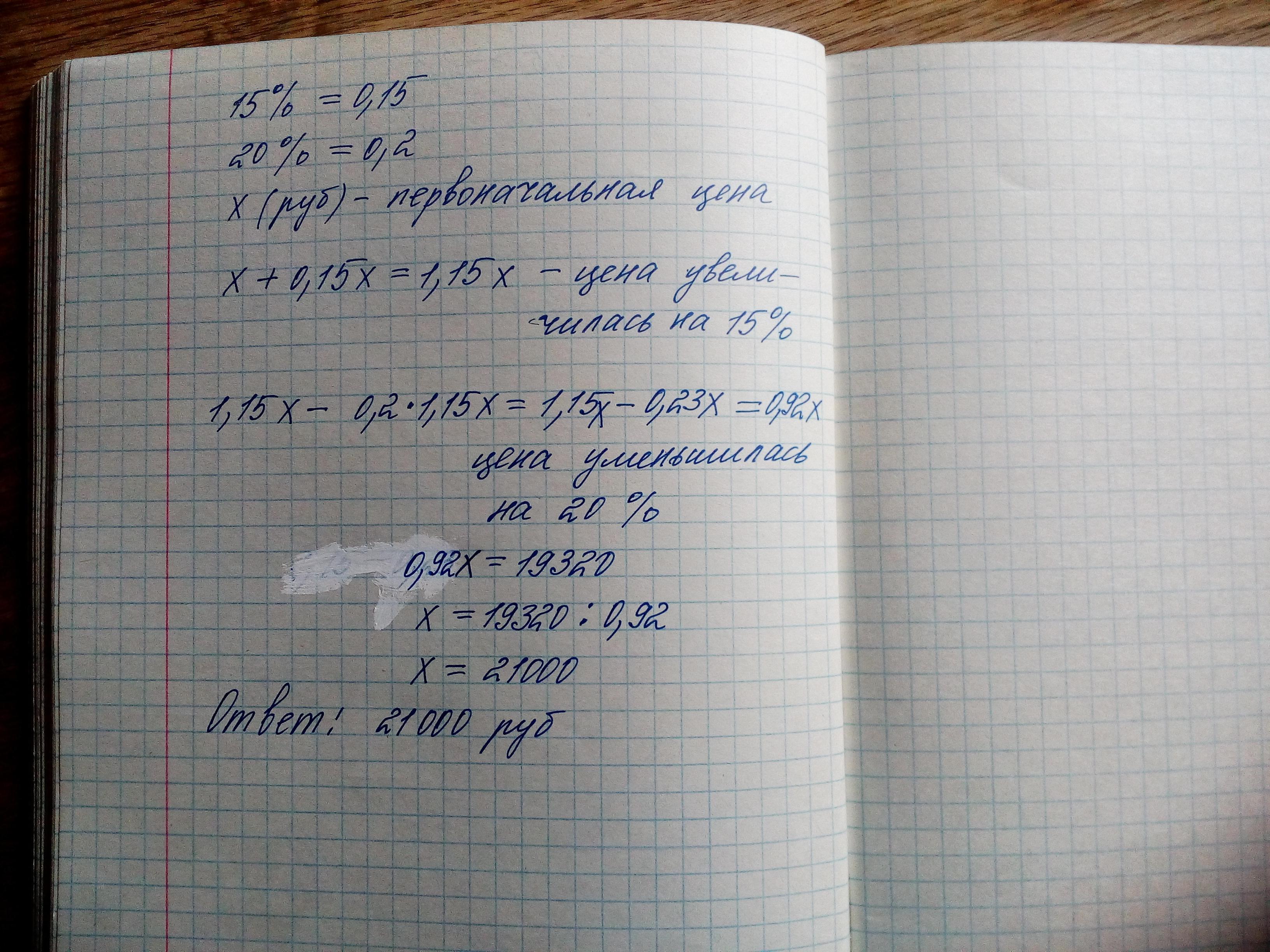 Цена холодильника увеличилась на 15 % а потом уменьшилась на 20% после этого он стал стоить 19320 рублей сколько стоил этот холодильник изначально.Как решить эту задачу уравнением ну типо пусть x руб первоначальная цена