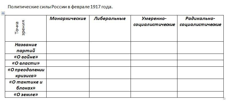 ПОМОГИТЕ заполнить таблицу! 9 класс. История. Политические силы России в феврале 1917 года!