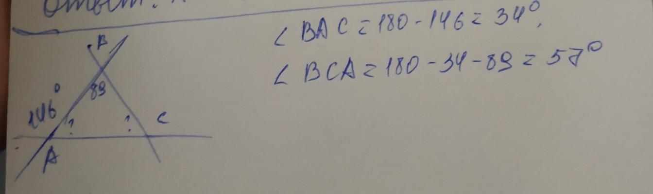 один из внешних углов треугольника равен 146 градусов. найдите углы треугольника не смежные с ним если один из них равен 89 градусов
