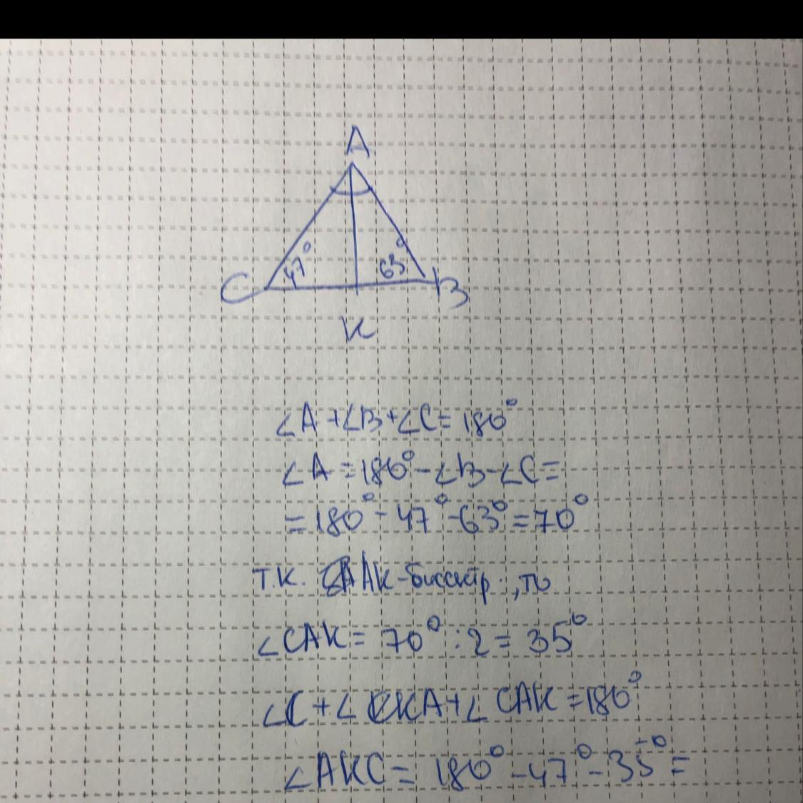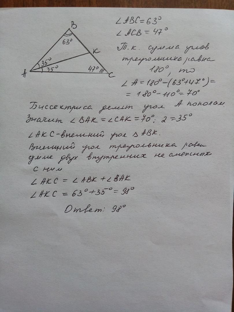В треугольнике АВС проведена биссектриса АК. Найдите величину угла AKC, если ∠АВС = 63° , ∠АСВ = 47°.