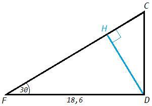 в треугольнике FDC известно,что FD=18,6 дм,угол F=30°,угол D=90°.Найдите расстояние от точки D до прямой FC. Пожалуйста очень срочно.Заранее спасибо
