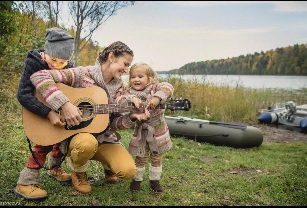 мать учит девочек как надо обращаться с музыкальным инструментом очень радостно они проводят время на природе!
