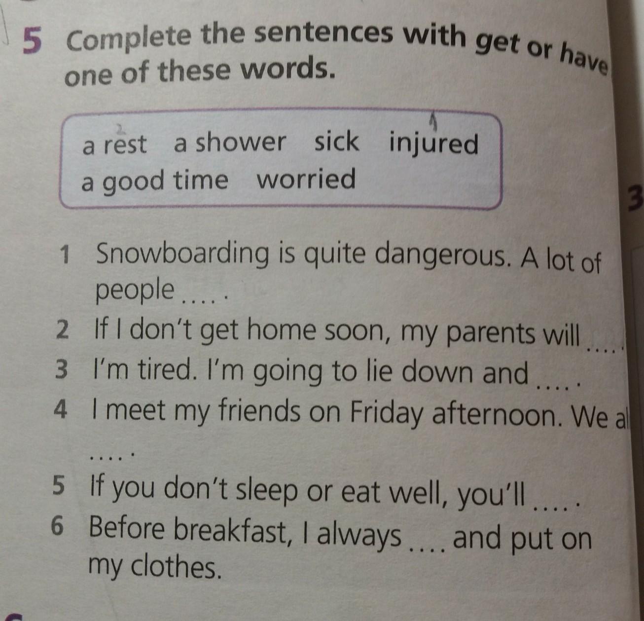 1 get injured 2 get worried 3 have a rest 4 have a good time 5 get sick 6 have a shower