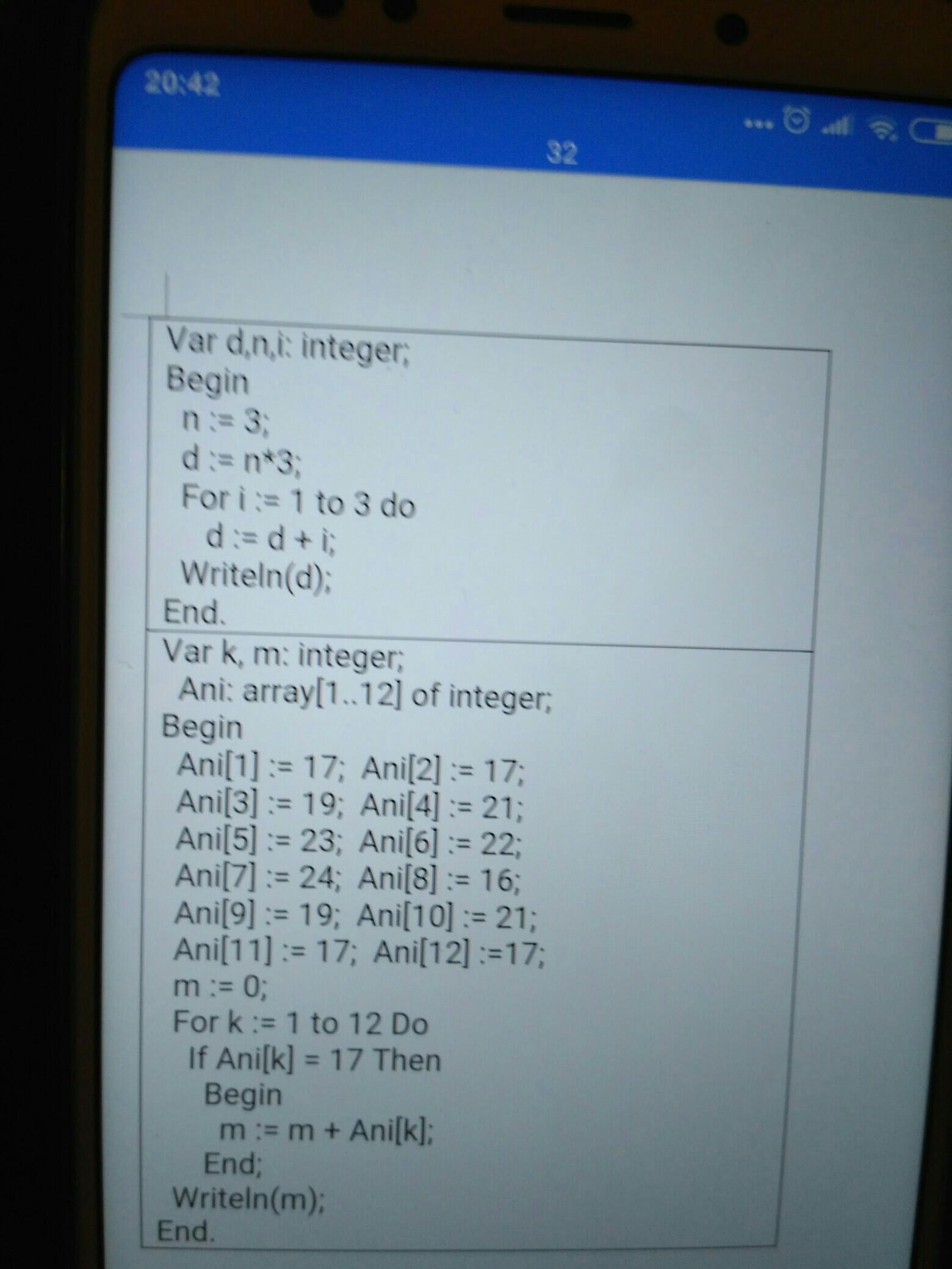 Есть переменные n=3 и d=n*3. В цикле к переменной d добавляется значение i(от 1 до 3, сумма всех - 6), d=9+6=15. В конце выводится переменная d.
