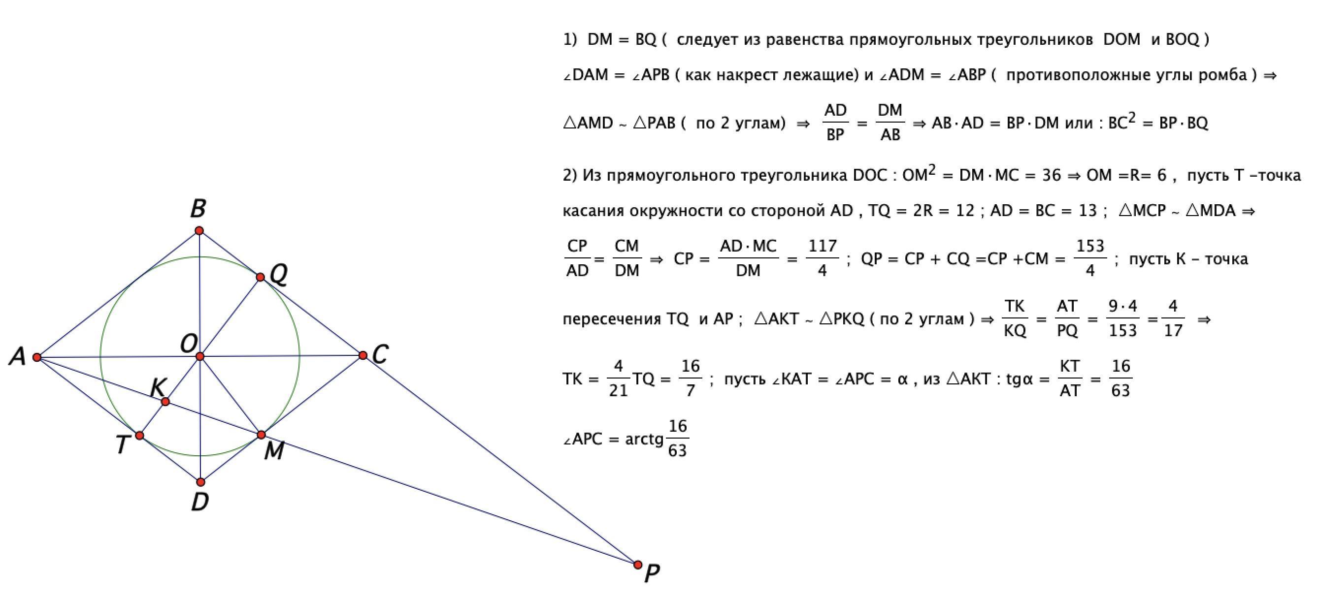 Окружность, вписанная в ромб ABCD, касается сторон CD и BC в точках M и Q соответственно. Прямые AM и BC пересекаются в точке P.
