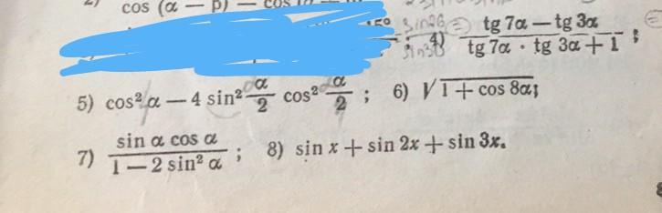 4);frac{tg7alpha-tg3alpha}{tg7alphacdot tg3alpha+1}=tg(7alpha-3alpha)=tg4alpha\\5);cos^2alpha-4sin^2fracalpha2cos^2fracalpha2=cos^2alpha-(2sinfracalpha2cosfracalpha2)^2=cos^2alpha-(sinalpha)^2=\=cos^2alpha-sin^2alpha=cos2alpha