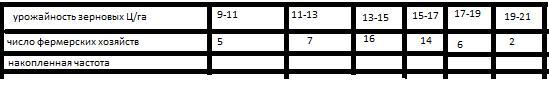 2)Наименьшая урожайность была у тех 5 хозяинов, у которых 9-11ц/га, а наибольшая у тех 2, у которых 19-21ц/га.