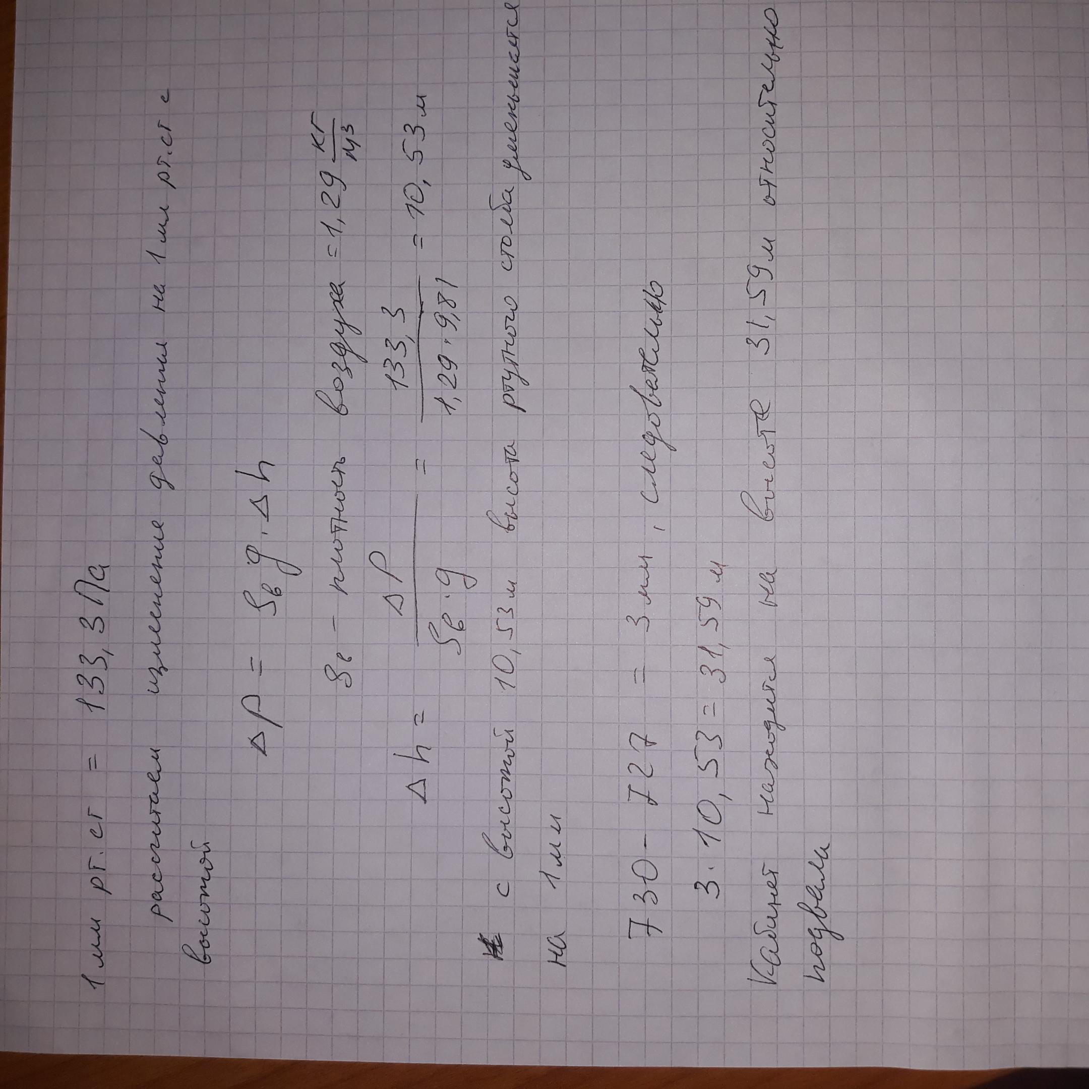 Школа состоит из пяти этажей. Давление на пятом этаже было 727 мм рт ст. В подвале 730. Найдите высоту кабинета, который находится на пятом этаже.