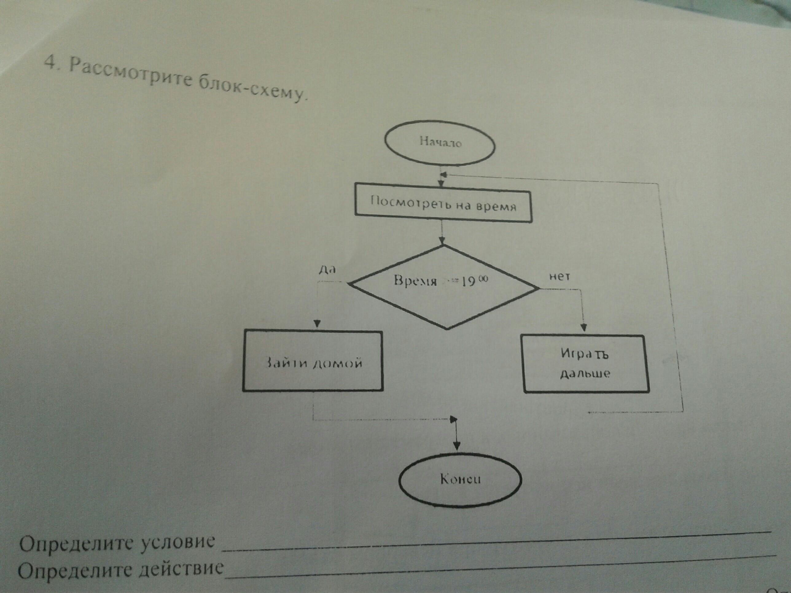 Действие: мы смотрим на время,если время больше или равно 19:00,то нужно зайти домой,конец. Если ещё нет 19:00, то играете дальше,затем все действия ещё раз повторяются до тех пор пока время не будет больше или равно 19:00.