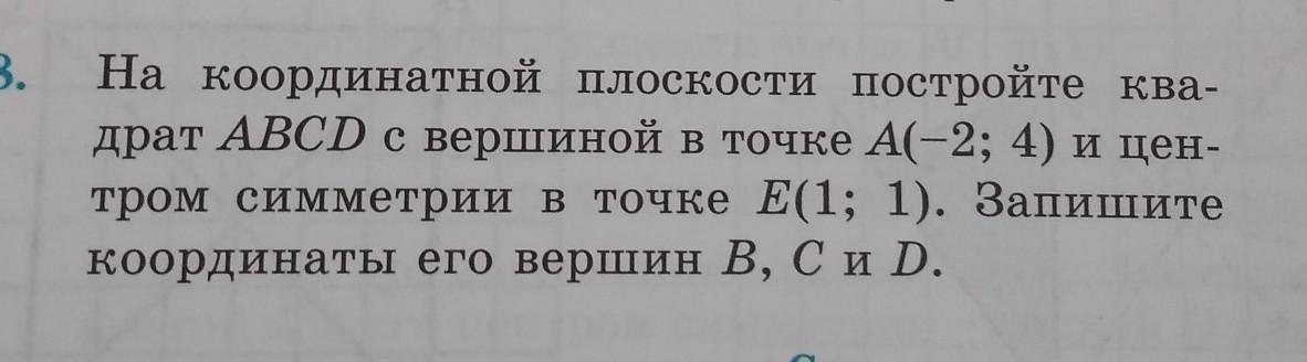 на координатной плоскости постройте квадрат ABCD с вершиной в точке А (-2;4) и центромсимместрии в точке Е(1;1). Запишите координаты ешэго вершин B,C и D.