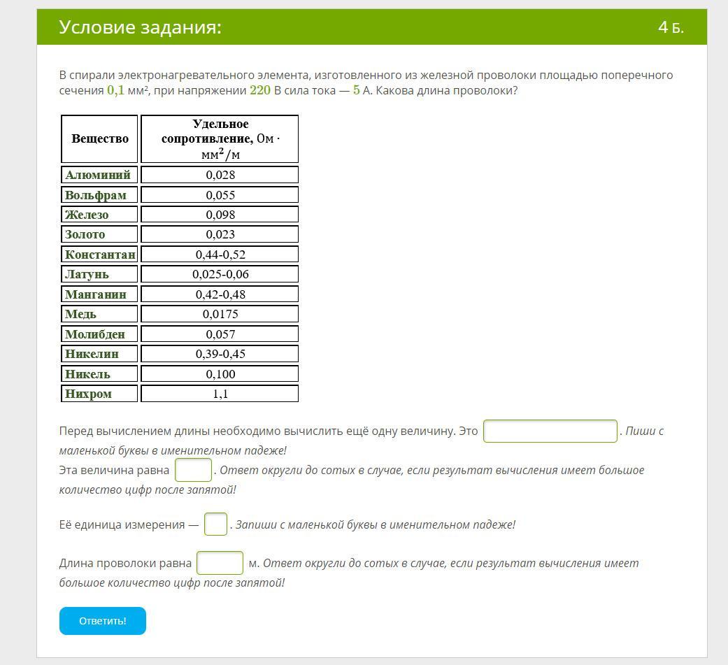 R=U/I=220/4=44 Ом L=R*S/p=44*0,1/0,098=44,9 Ом