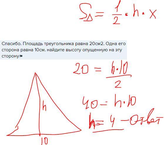 Спасибо. Площадь треугольника равна 20см2. Одна его сторона равна 10см. найдите высоту опущенную на эту сторону