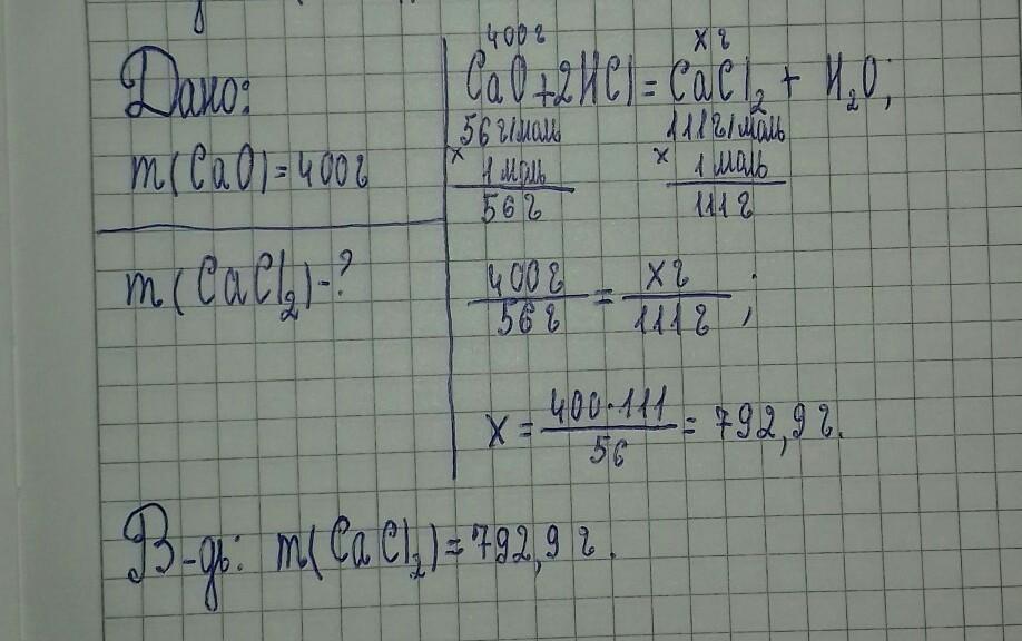 при взаимодействие 400г оксида кальция с соляной кислотой образовались соль хлорид кальция и вода найдите массу образовавшейся соли дам баллов срочно!!!