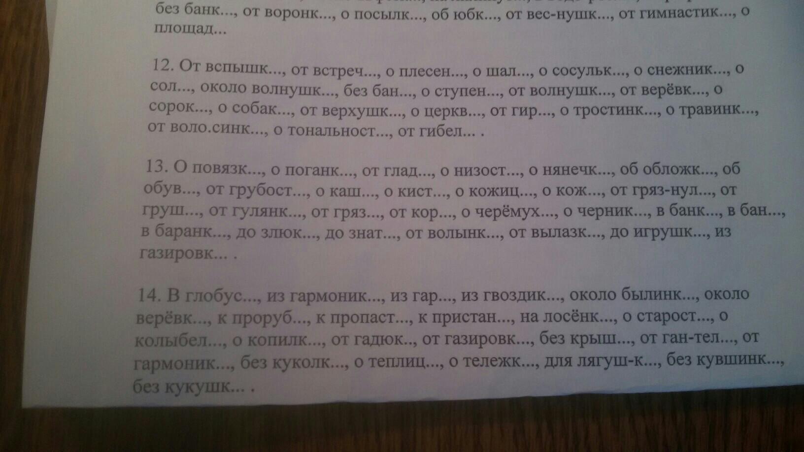 1)От вспышки,от встречи,о плесени,о шале,о сосульке,о снежинке,о соле,около волнушки,без бани,о ступени,от волнушки,от веревки,о сороке,о собаке,от верхушки,о церкви,от гири,о тростинке,о травинке,от волосинки,о тональности,от гибели