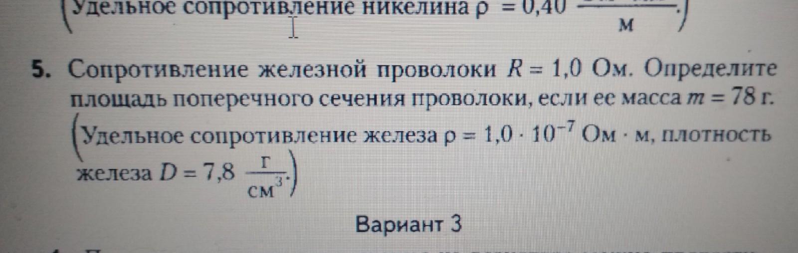 Сопротивление железной проволоки R=1,0 Oм определитель площадь поперечного сечения проводки если её масса m=78 г удельное сопротивление железа p=1,0*10^-7 Ом*м плотность железа D=7.8 г/см3
