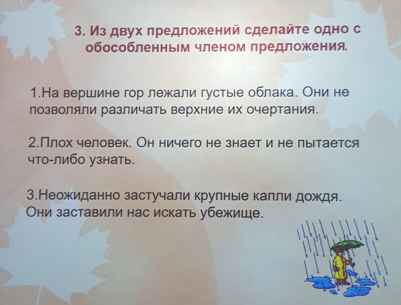 3) неожиданно застучали крупные капли дождя ,заставлявшие нас искать убежище.