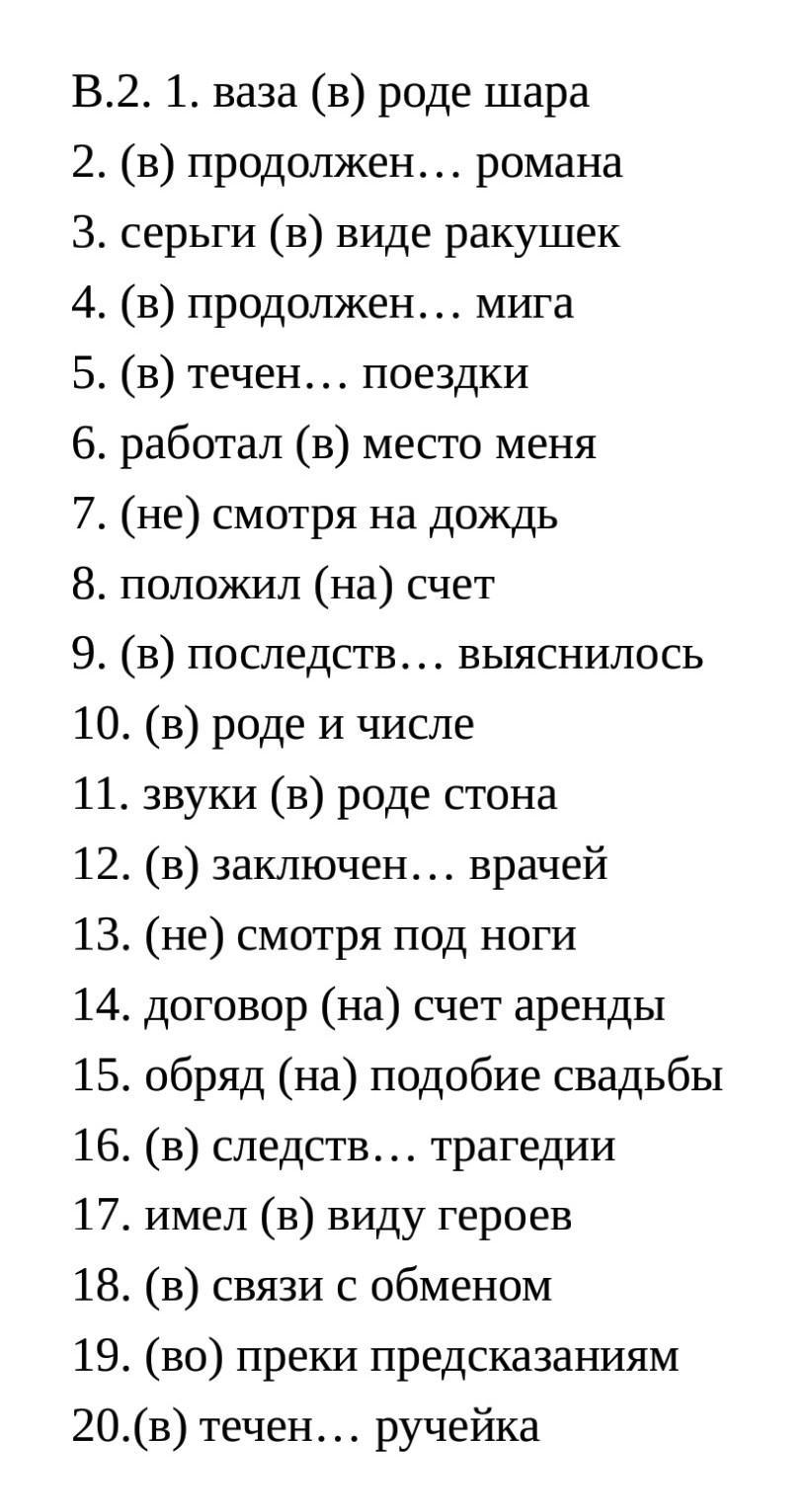 Вроде, в продолжении, в виде, в продолжении, в течении, вместо, несмотря, на счёт, в последствии, в роде, вроде, в заключении, не смотря, на счёт, на подобие, в следствии, ввиду, в связи, вопреки, в течении
