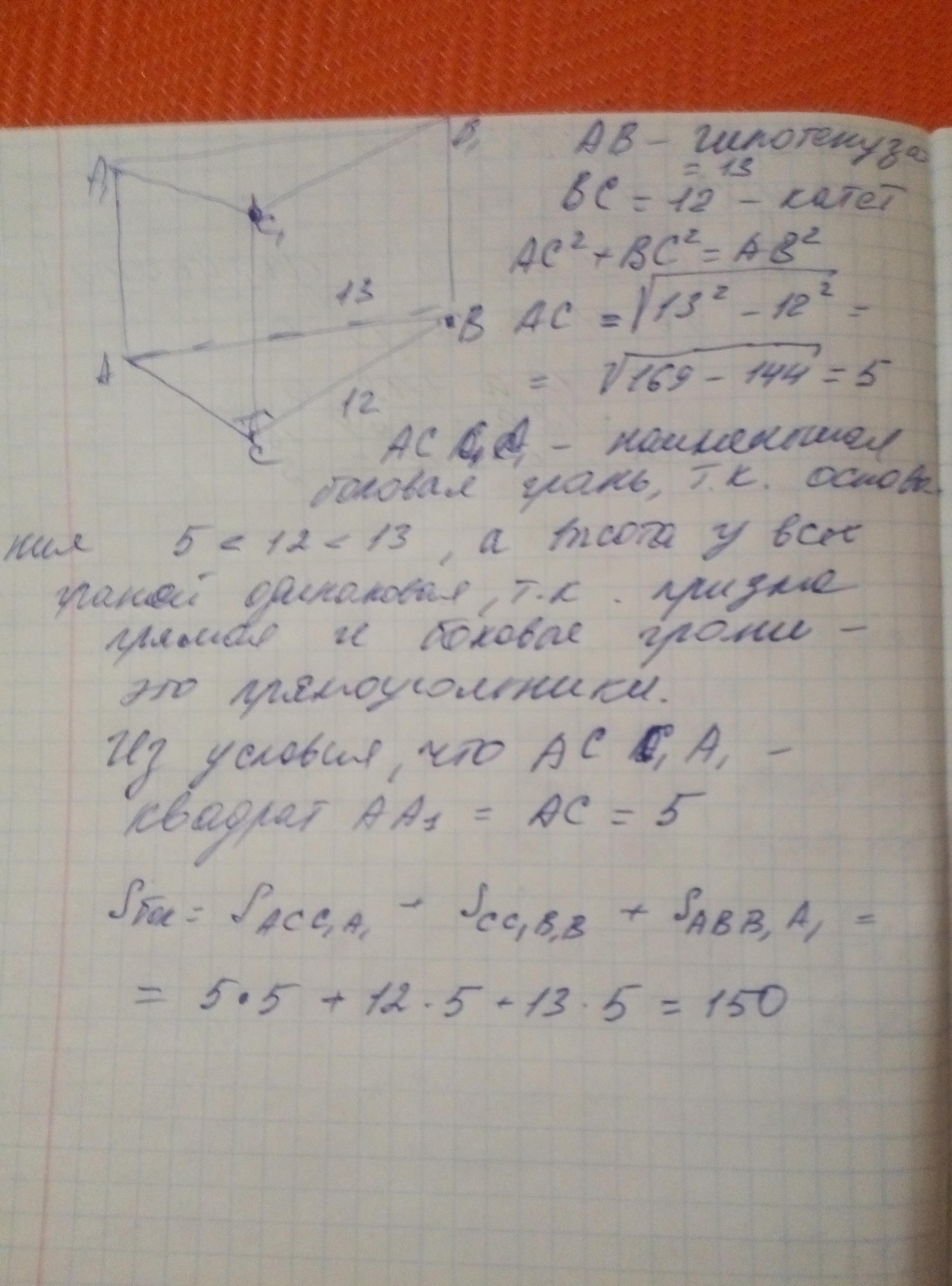 Основание прямой призмы - прямоугольный треугольник с катетом 12 и гипотенузой 13 . Найдите площадь боковой поверхности призмы, если ее наименьшая боковая грань - квадрат . С РИСУНКОМ !!!