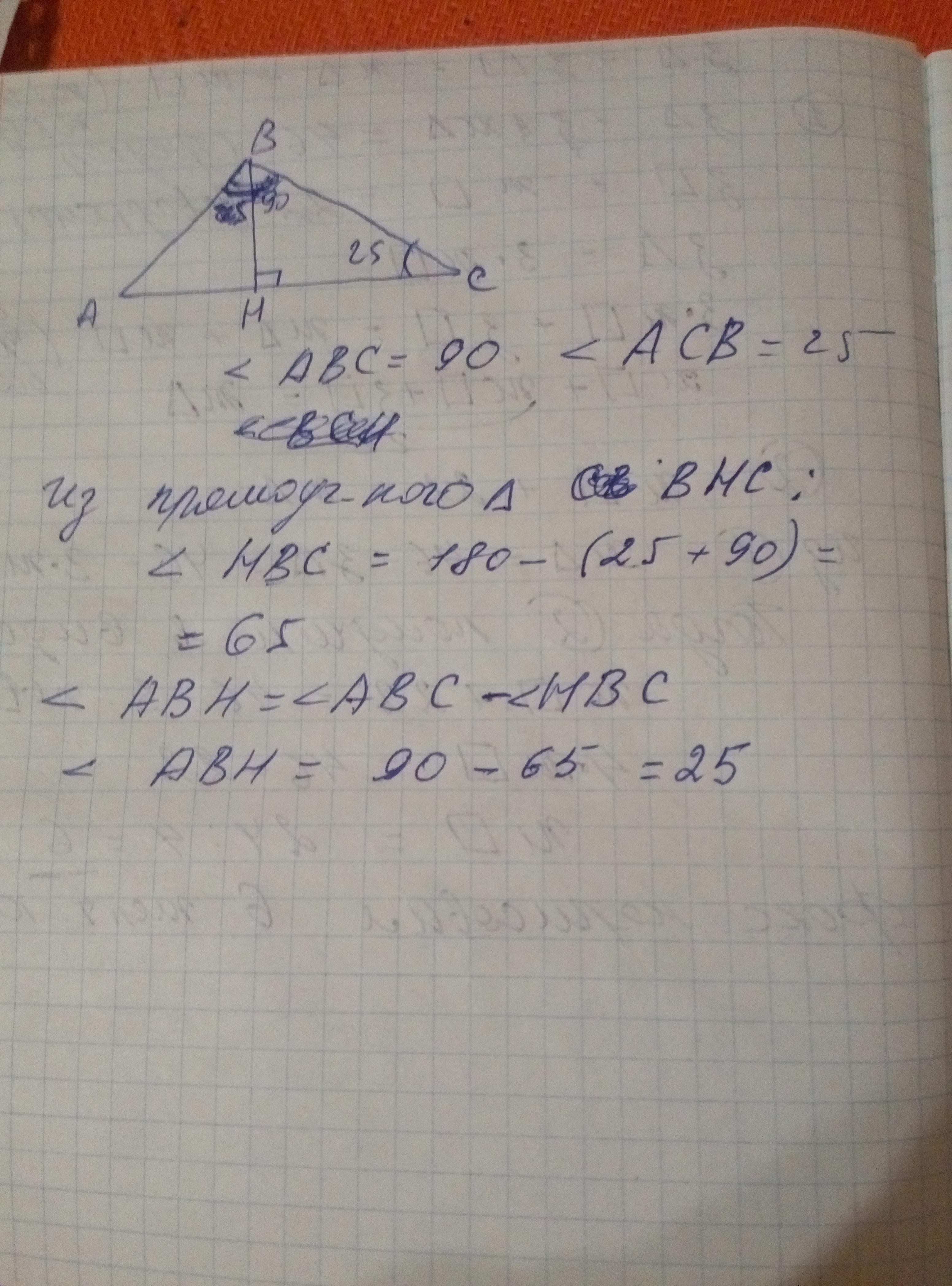 В прямоугольном треугольнике ABC с прямым углом B проведена высота BH.Найдите угол ABH,если угол ABC=25 градусов.Ответ дайте в градусах.