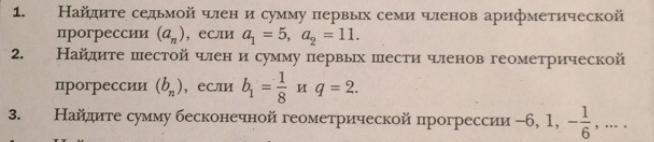 1.;a_1=5,;a_2=11\d=11-5=6\a_7=a_1+6d=5+6cdot6=5+36=41\S_7=frac{2a_1+6d}2cdot7=(a_1+3d)cdot7=(5+3cdot6)cdot7=(5+18)cdot7=23cdot7=161\\2.;b_1=frac18,;q=2\b_6=b_1cdot q^5=frac18cdot32=4\S_6=frac{b_1(1-q^6)}{1-q}=frac{frac18(1-64)}{1-2}=frac{frac18cdot63}1=frac{63}8=7frac78\\3.;b_1=-6,;b_2=1,;b_3=-frac16\q=frac{b_2}{b_1}=-frac16\S_n=frac{b_1}{1-q}=frac{-6}{1+frac16}=-frac6{frac76}=-frac{36}7=-5frac17