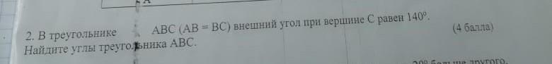 Угол С в треугольнике АВС - 180-140=40°. Угол А равен углу С =40° (треугольник АВС равнобедренный АВ=ВС по условию). Угол В равен 180-40*2=100°. Углы треугольника: А=40°, В=100°, С=40°.