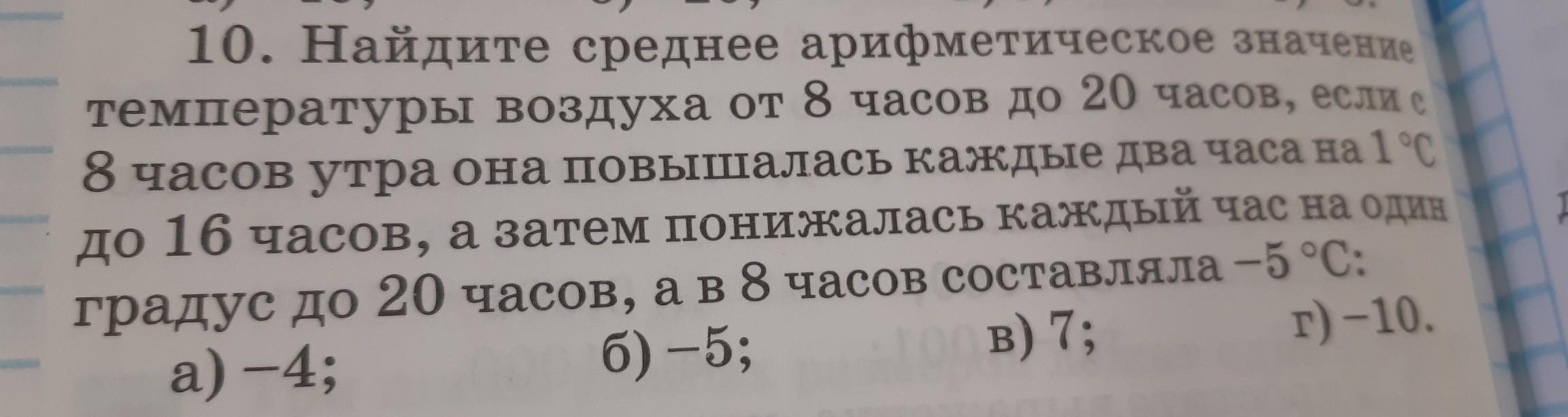 В итоге температура в 20 часов стала такой же, как и была в 8 утра, а значит и среднее арифметическое равно -5, так как (-5-5)/2=-10/2=-5
