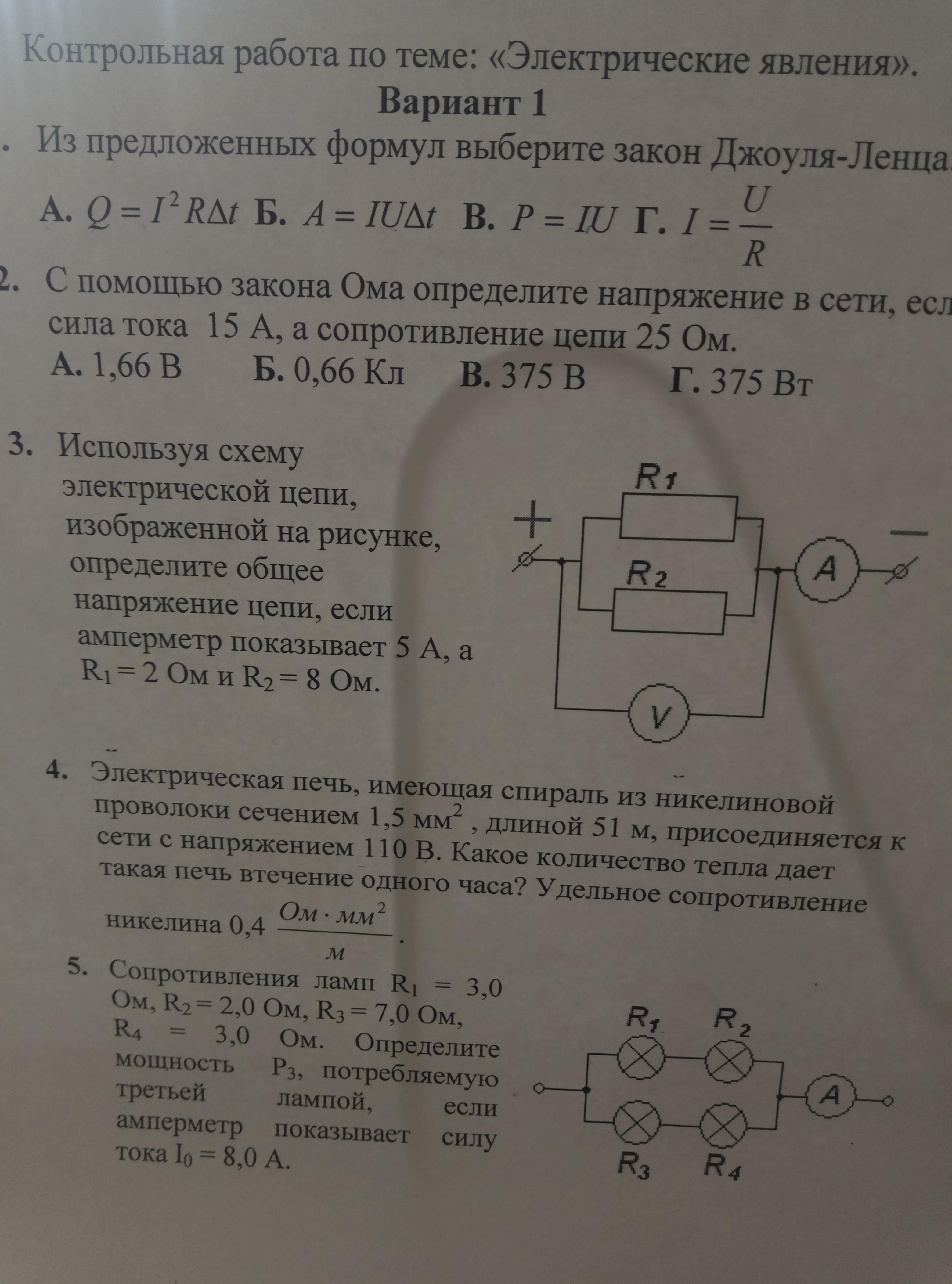 Используя схему электрической цепи, изображенной на рисунке, определите общее напряжение цепи, если амперметр показывает 5А, а R1 = 2 Ом и R2 = 8 Ом.
