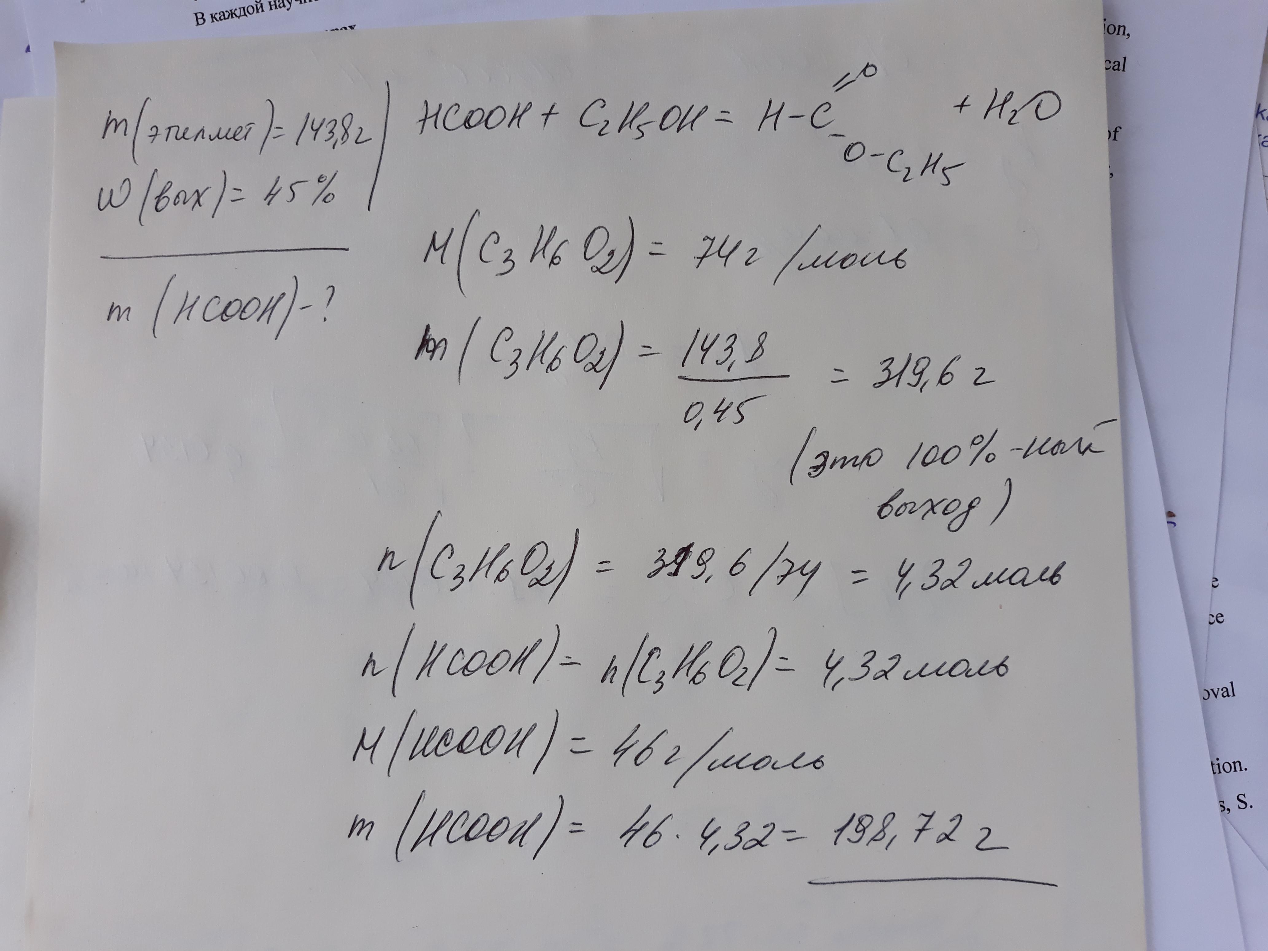 Рассчитайте массу муравьиной кислоты необходимую для получения этилметаноата массой 143,8г , при выходе 45%
