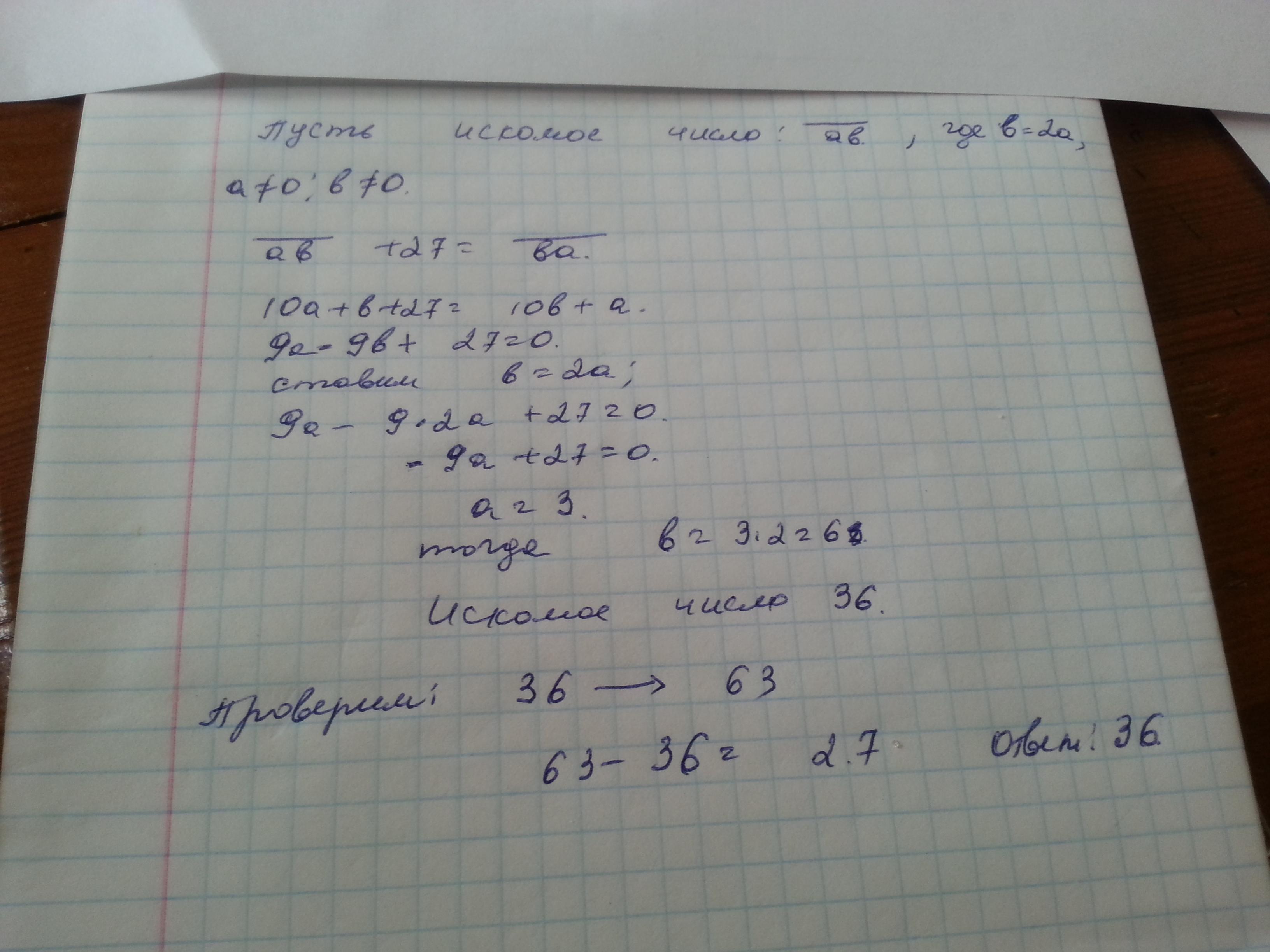 Реши пожалуйста ещё одну. ЕСЛИ ИЗ НАТУРАЛЬНОГО ДВУЗНАЧНОГО ЧИСЛА ВЫЧЕСТЬ 36,ТО ПОЛУЧИТСЯ ЧИСЛО, ЗАПИСАННОЕ ТЕМИ ЖЕ ЦИФРАМИ, НО В ОБРАТНОМ ПОРЯДКЕ. НАЙДИТЕ ИСХОДНОЕ ЧИСЛО, ЕСЛИ ЦИФРА ДЕСЯТКОВ УМЕНЬШЕННАЯ НА 1,В ДВА РАЗА БОЛЬШЕ ЦИФРЫ ЕДИНИЦ ЧИСЛА. ПОМОГИ!!