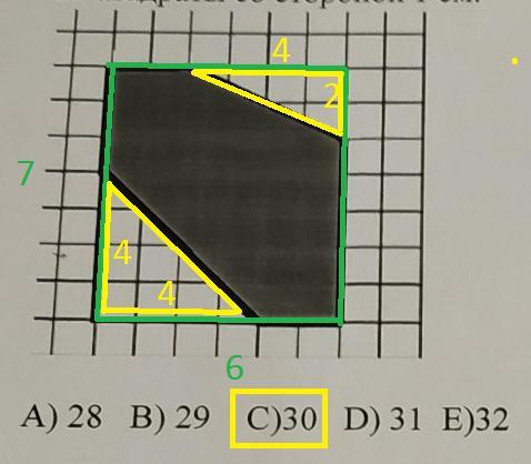 S(фигуры)=S( прямоугольника)- S₁-S₂=6·7 - (1/2)4·4 - (1/2)4·2=42-8-4=30