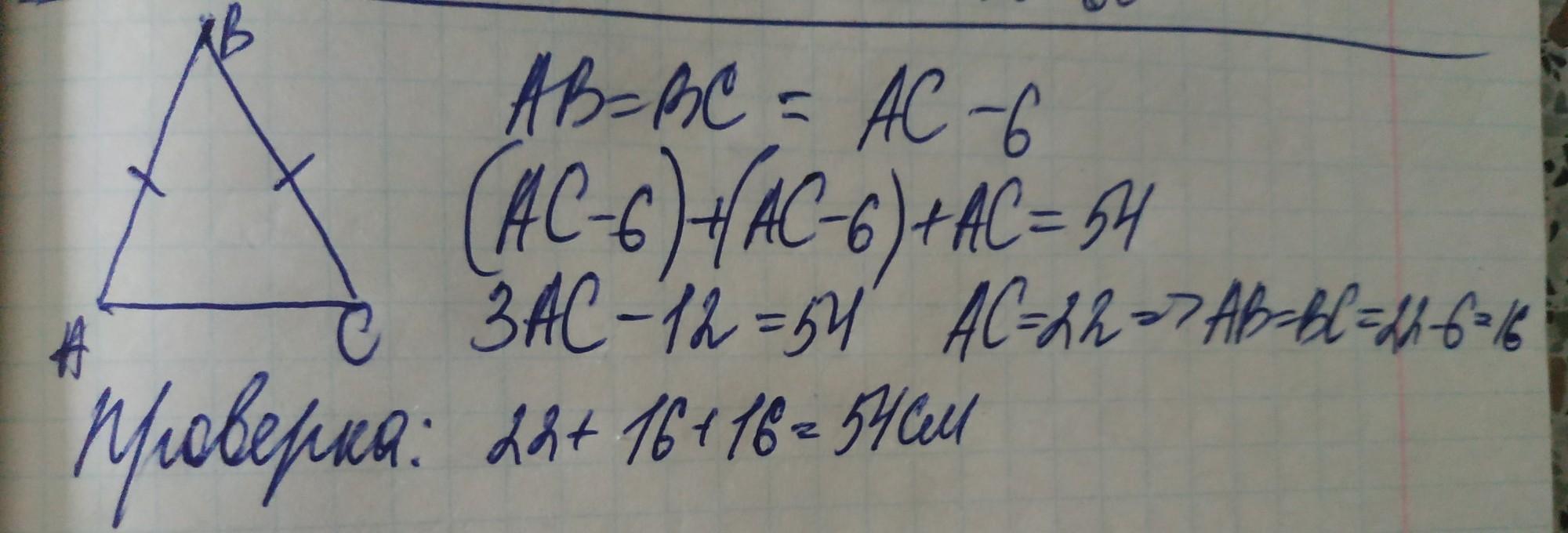 Периметр равнобедренного тупоугольного треугольника равен 54 см а одна из его сторон на 6 см больше другой. Найдите стороны треугольника.