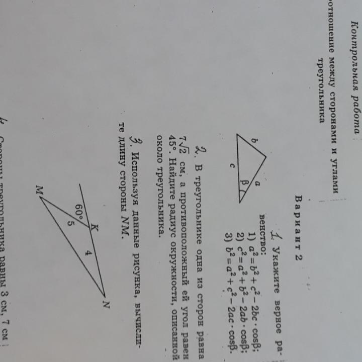 MN² = MK² + KN² - 2*MK*KN*Cos∠K