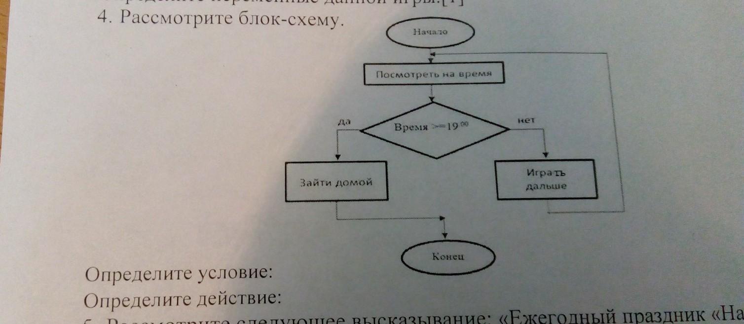 Объяснение действия: мы смотрим на время,если время больше или равно 19:00,то нужно зайти домой,конец. Если ещё нет 19:00, то играете дальше,затем все действия ещё раз повторяются до тех пор пока время не будет больше или равно 19:00.